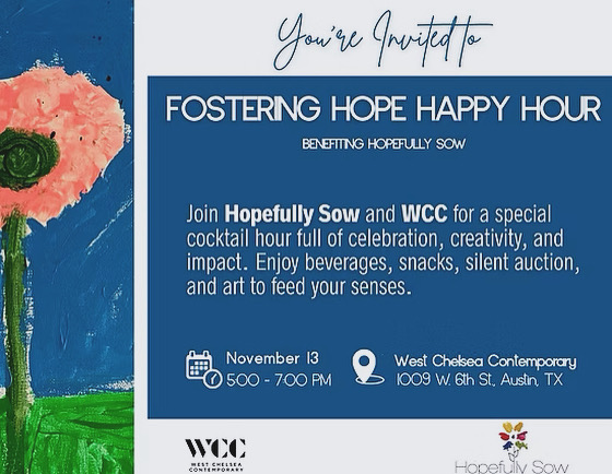 We’d love to extend an invitation to join us for our Fostering Hope Happy Hour on November 13th at West Chelsea Contemporary. It’s a fun, uplifting evening celebrating creativity, connection, and the incredible people who make our mission possible.Enjoy drinks, light bites, art, and good company — all while supporting foster youth in Central Texas.https://www.hopefullysow.org/fostering-hope