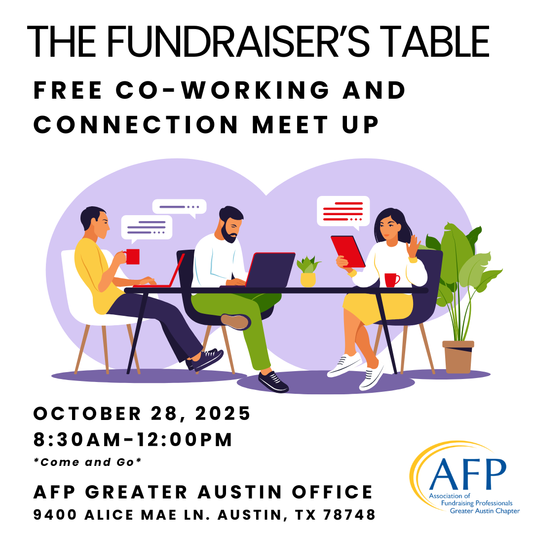 The Fundraiser’s Table: Free Coworking & Connection Pull up a seat at The Fundraiser’s Table—a welcoming coworking space for connection, collaboration, and community. Bring your laptop, your latest project, and your ideas to share. Work alongside peers who understand the joys and challenges of fundraising, and lean on one another for advice, feedback, and encouragement. Coffee and WiFi are provided, so drop in anytime and make meaningful progress together. RSVP is not required but appreciated! Click here to RSVP!Contact: [email protected] |